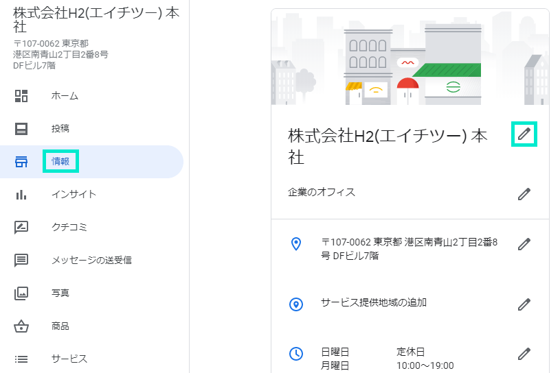 - Googleビジネスプロフィールのダッシュボードから「情報」を選択し、編集したい項目をクリック
