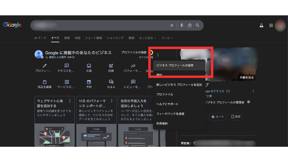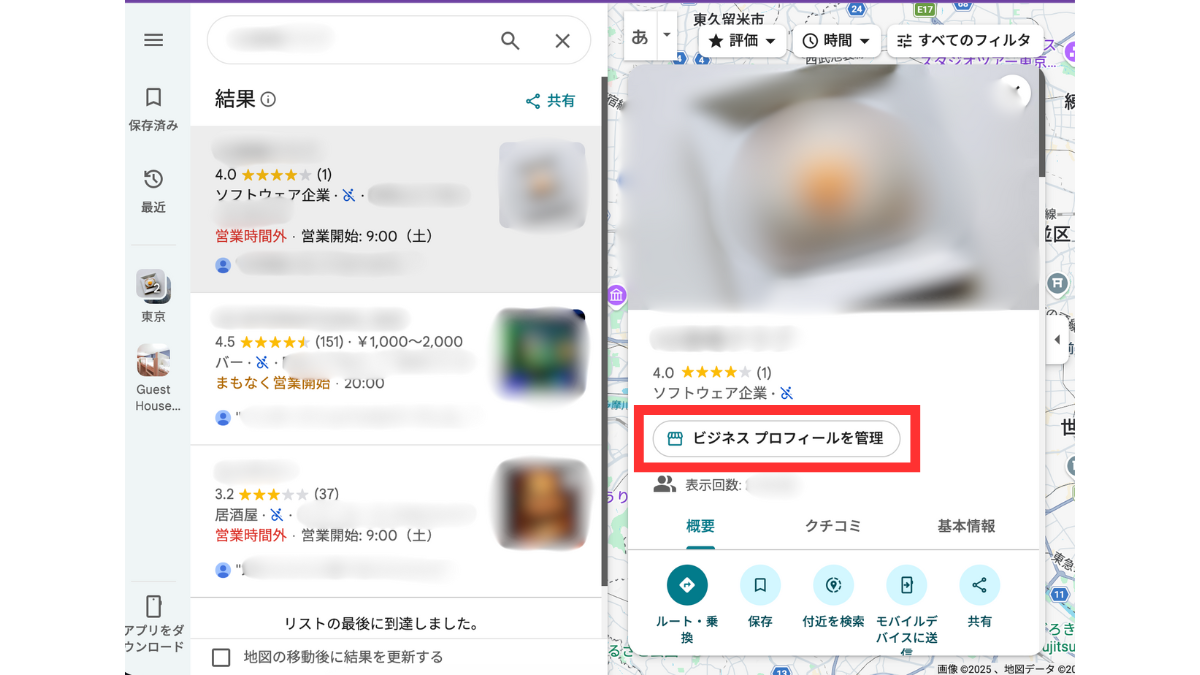 名称と口コミのさらに下にある「ビジネスプロフィールを管理」をクリックすれば、管理画面に移行できます。
