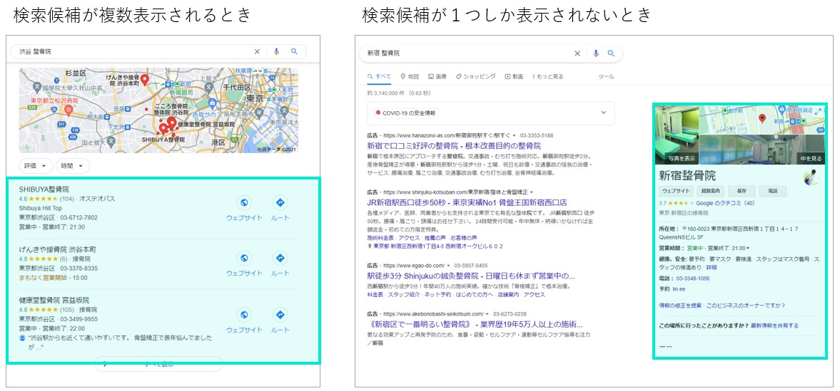 それに近い事例として「地域×業種」で検索したときに「地域名業種名」のお店しか表示されない場合があります。例えば「東京 整骨院」で検索したときに「東京整骨院」が1件のみ表示されるといった場合です。これは「東京」と「整骨院」に関連性が強いビジネスが1件のみという判断をされたということです。